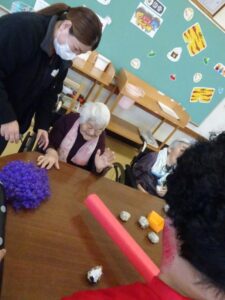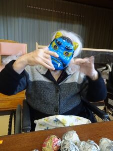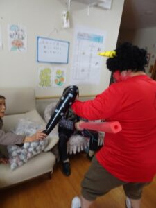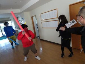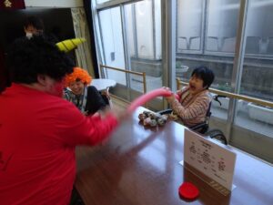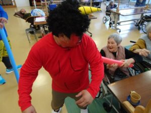 陵幸会では鬼に扮した職員がご利用者や職員もとに訪れ、悪いものを追い出すため「鬼は外!」と鬼をめがけて豆を投げていただきました。
